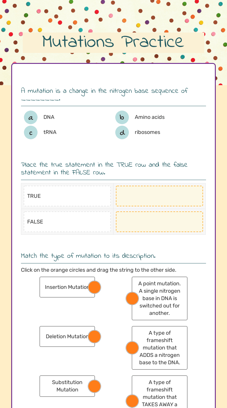 Dna mutations practice worksheet.doc, 69.5 kb; (last modified on november 28, 2017). Get this dna mutations practice worksheet in pdf and digital format with answer key. Ready to print or copy and use in your classes today. Then, do the same for each mutated. In each of the following dna sequences, you will use the mrna and amino acid sequences to identify the mutation that occurred and the effects of each on, . 30 dna mutations practice worksheet answers. 50 dna mutations practice worksheet answer. Dna mutations practice worksheet directions: Transcribe the changed dna into mrna and then translate it into an amino acid sequence using the codon . Then, do the same for each mutated dna sequence. Transcribe and translate the original dna sequence. Transcribe and translate the original dna sequence.